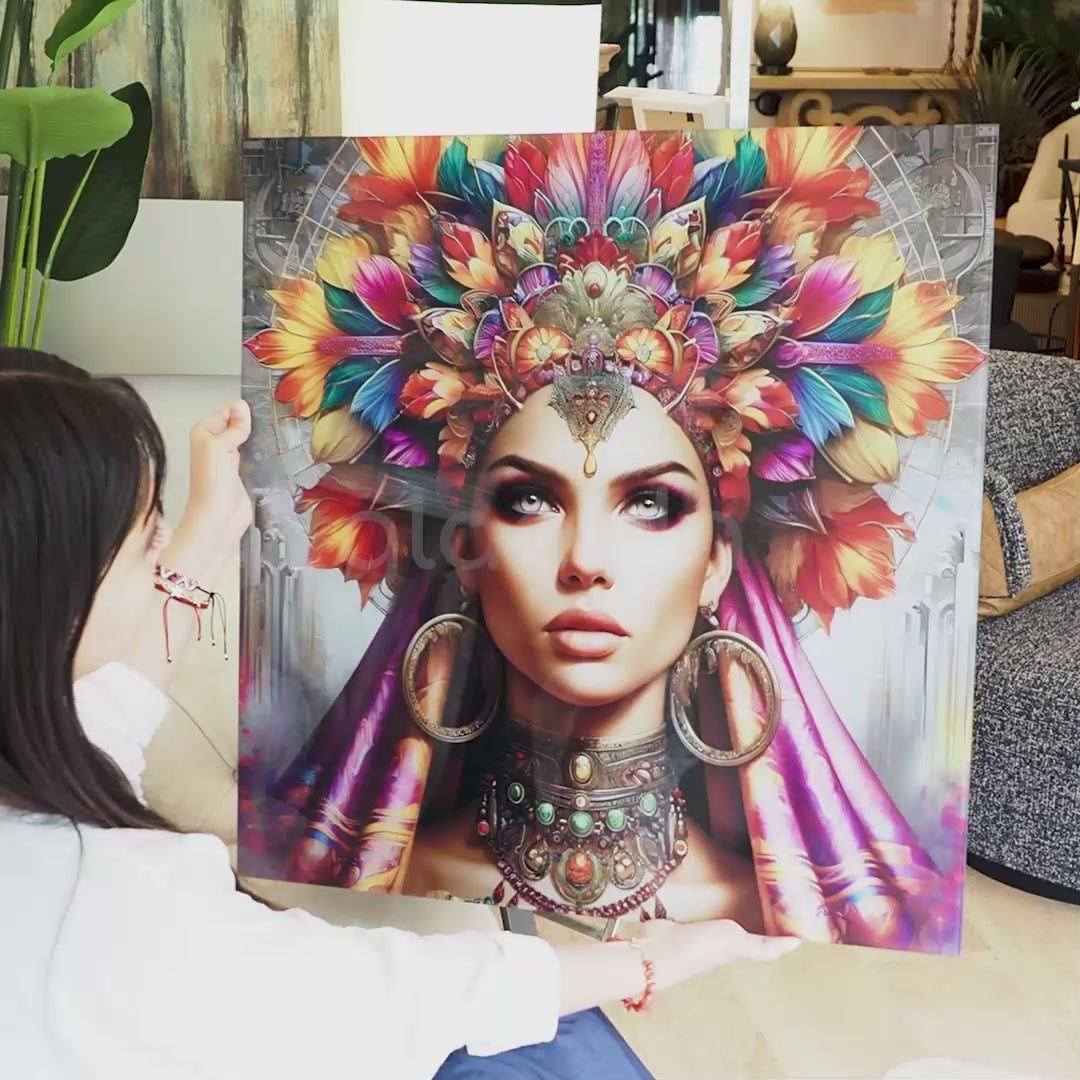 Göz kamaştırıcı renklerin bir araya gelmesiyle oluşan bir başlık, zarafeti ve gücü temsil ediyor. Bakışlarındaki derinlik, anlamsız bir öykünün kapılarını aralar. Takıların ve süslemelerin detayları, tarih öncesi bir medeniyetin izlerini sürüyor. Evine bu görsel zenginliği kat, her günü bir sanat eseriyle buluşmanın ilhamıyla başla.